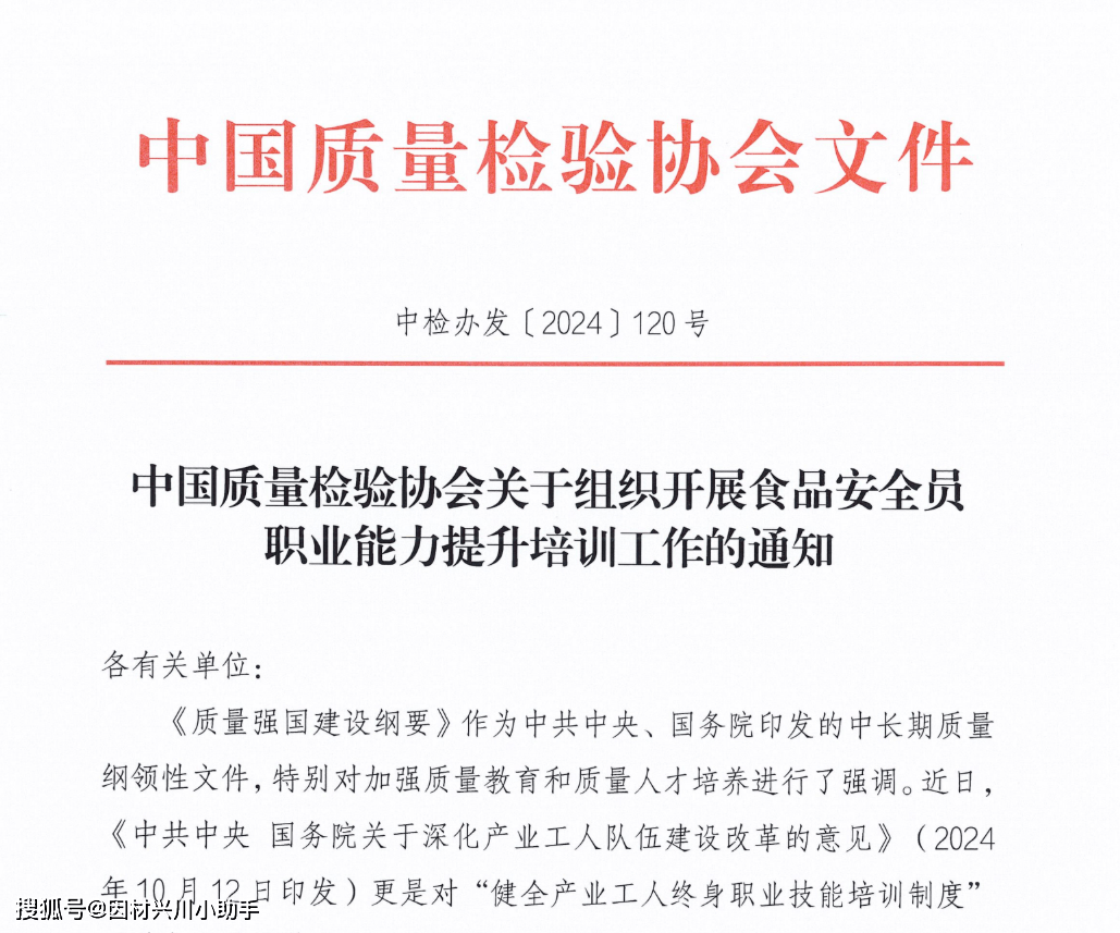 按照《食物平安法》、《劳动法》等法令律例的,按关决策摆设和《企业落实食物平安从体义务监视办理》(市场监管总局令第60号)等从管部分的政策要求,为了深切贯彻落实新时代人才强国计谋,督促泛博企业和查验检测机构提拔承担质量平安从体义务的能力,引领食物平安员精确把握其职责和权限并持续提拔岗亭履责能力,持续深切贯彻落实食物平安工做“四个最严”的要求,出力阐扬质量查验行业组织正在“党委带领、从导、政策支撑、企业从体、社会参取”高技强人才工做系统中不成或缺的积极感化,合力推进质量社会共治,帮力提拔食物平安员专业素养能力和程度,指导企业加强质量工做,推进企业产物和办事质量提拔,充实阐扬食物平安员正在产质量量提拔中的主要感化,办事高质量成长,推进质量强国扶植?。
